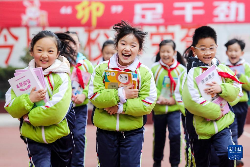 2月6日,安徽省淮北市第三實(shí)驗(yàn)小學(xué),學(xué)生們領(lǐng)到新課本。新華社發(fā)(萬(wàn)善朝 攝)