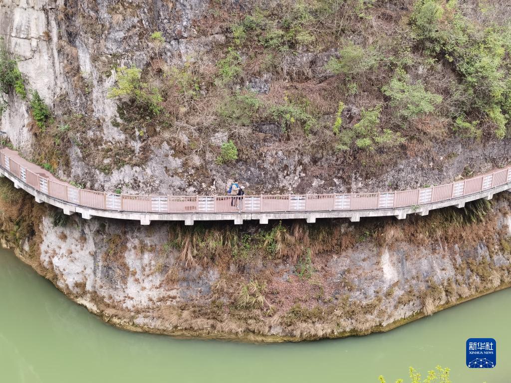 游客在正在升級改造的貴州省開陽縣香火巖瀑布景區內逗留(2023年3月18日攝,手機照片)。新華社記者 向定杰 攝