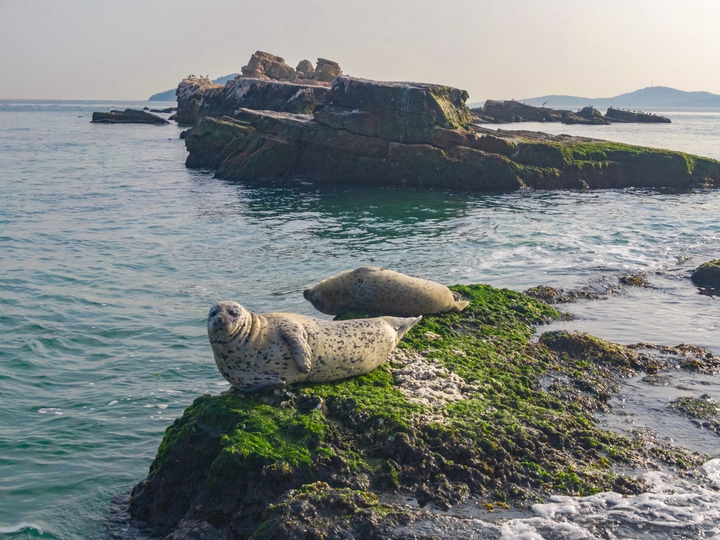 2023年4月2日,在山東煙臺長島海域,斑海豹在礁石上休憩(無人機照片)。新華社發(張維康 攝)