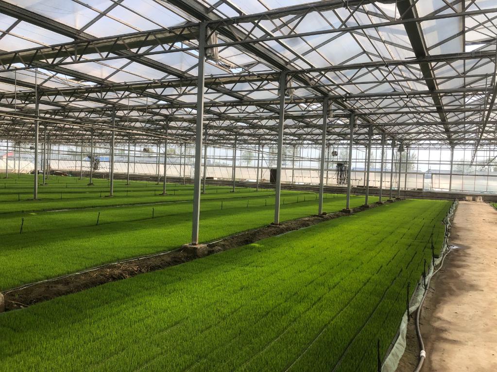 記者來到遼寧省盤錦市太平凱地農(nóng)機(jī)服務(wù)專業(yè)合作社,整齊排列的20座育苗大棚里,綠油油的秧苗茁壯成長,正陸續(xù)往5000畝水田里“搬家”。