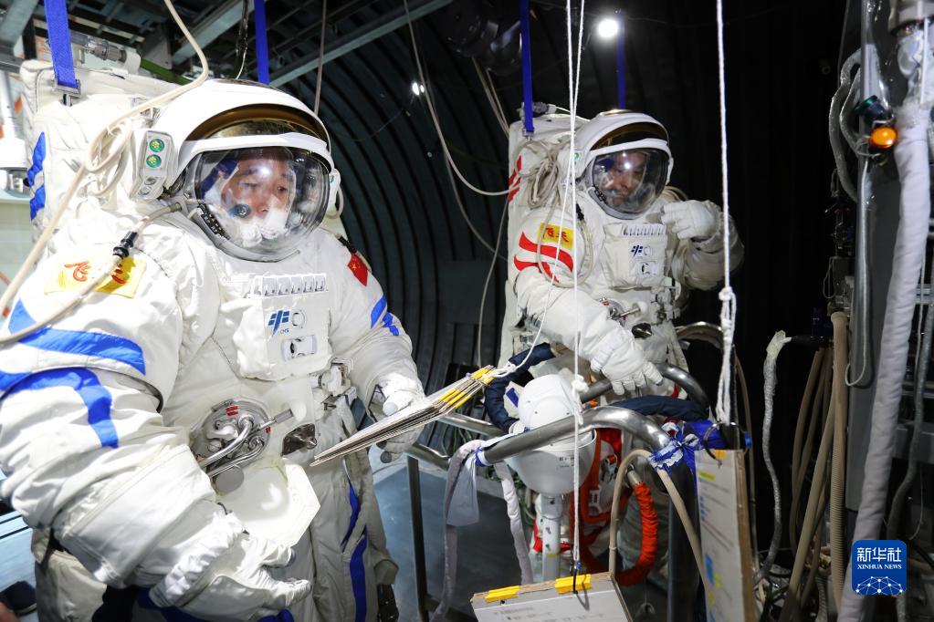 神舟十六號航天員乘組進行航天服操作訓練(2022年10月19日攝)。新華社發(徐部 攝)