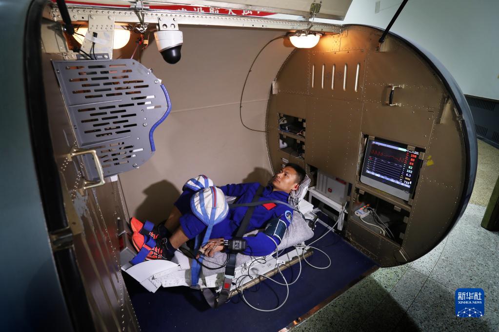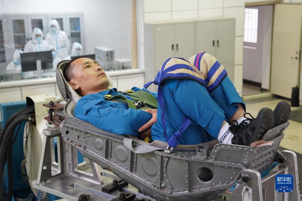 神舟十六號航天員朱楊柱在進行振動體驗(2022年4月27日攝)。新華社發(王夏陽 攝)
