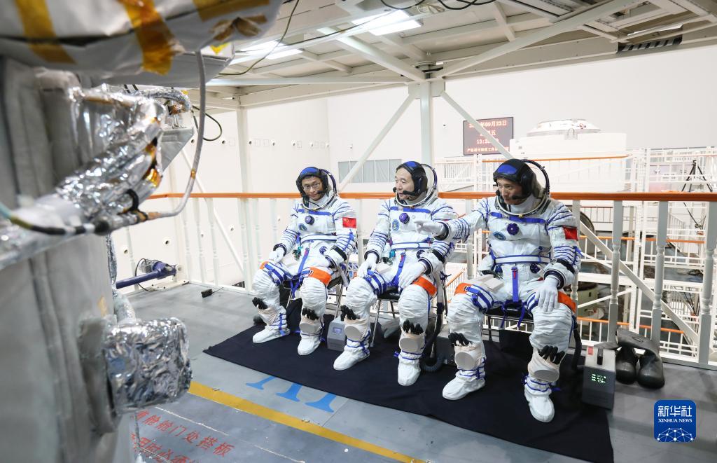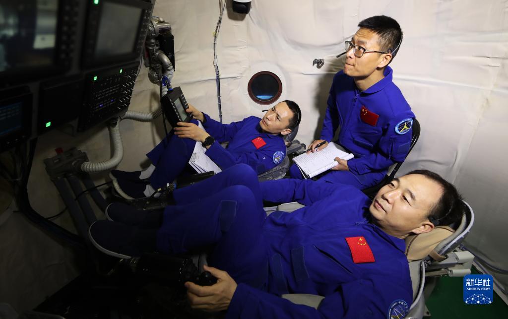 神舟十六號航天員乘組在人船合練中交流(2022年9月23日攝)。新華社發(徐部 攝)