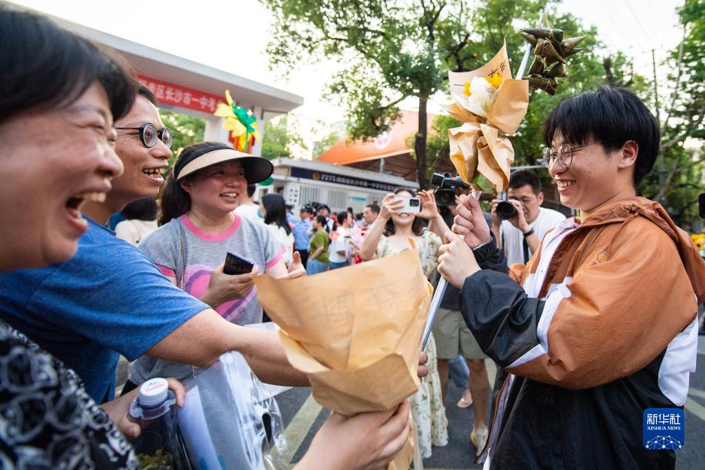 6月9日,在長沙市第一中學考點,家長們迎接考生(右一)走出考場。