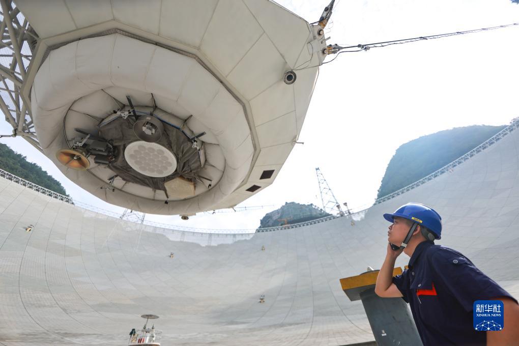 7月26日,工作人員在“中國天眼”饋源艙前(維護保養期間拍攝)。新華社記者 歐東衢 攝
