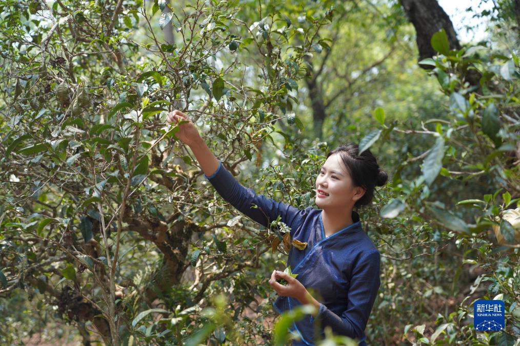 4月19日,當地村民在景邁大寨古茶林采摘春茶。新華社發(盧磊 攝)