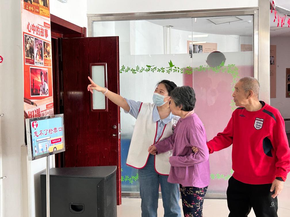 2023年5月3日,醫務社工在“忘不了電影院”給認知癥老人推薦電影。