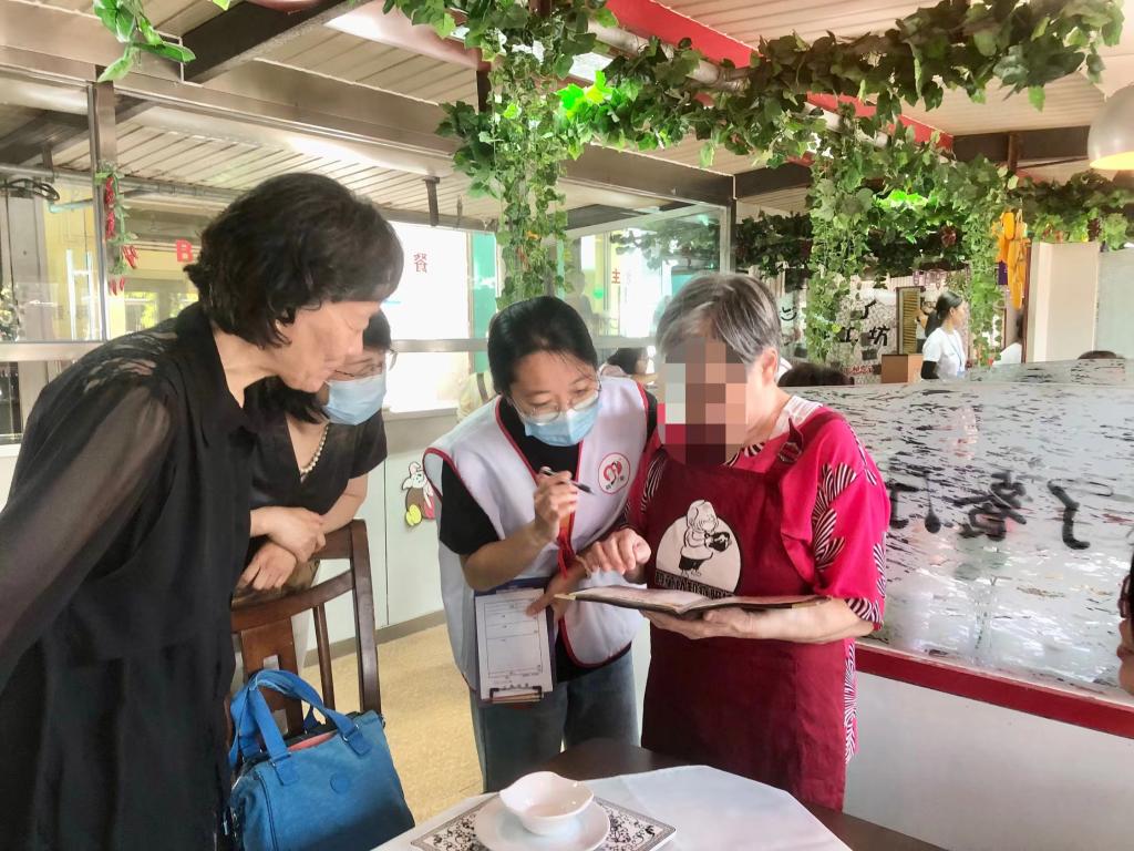 2023年9月20日,在“忘不了餐廳”,醫務社工協助認知癥老人為顧客點餐。