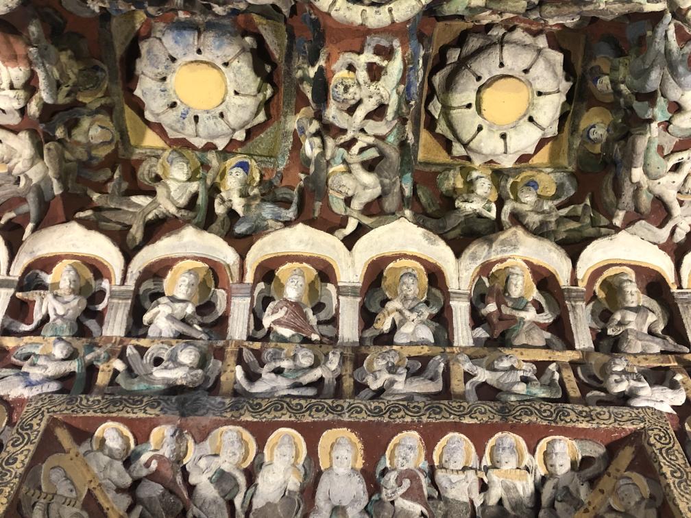 步入第12窟,前室頂部壁上笑意盈盈的“伎樂(lè)天”引人入勝,他們手捧各式樂(lè)器,除了中原漢式琴、箏、簫,還有龜茲細(xì)腰鼓、波斯豎箜篌等,仿佛一支整齊的樂(lè)隊(duì),華麗多姿、翩翩起舞。觀賞間恍如穿越時(shí)空重回當(dāng)年的音樂(lè)盛典。