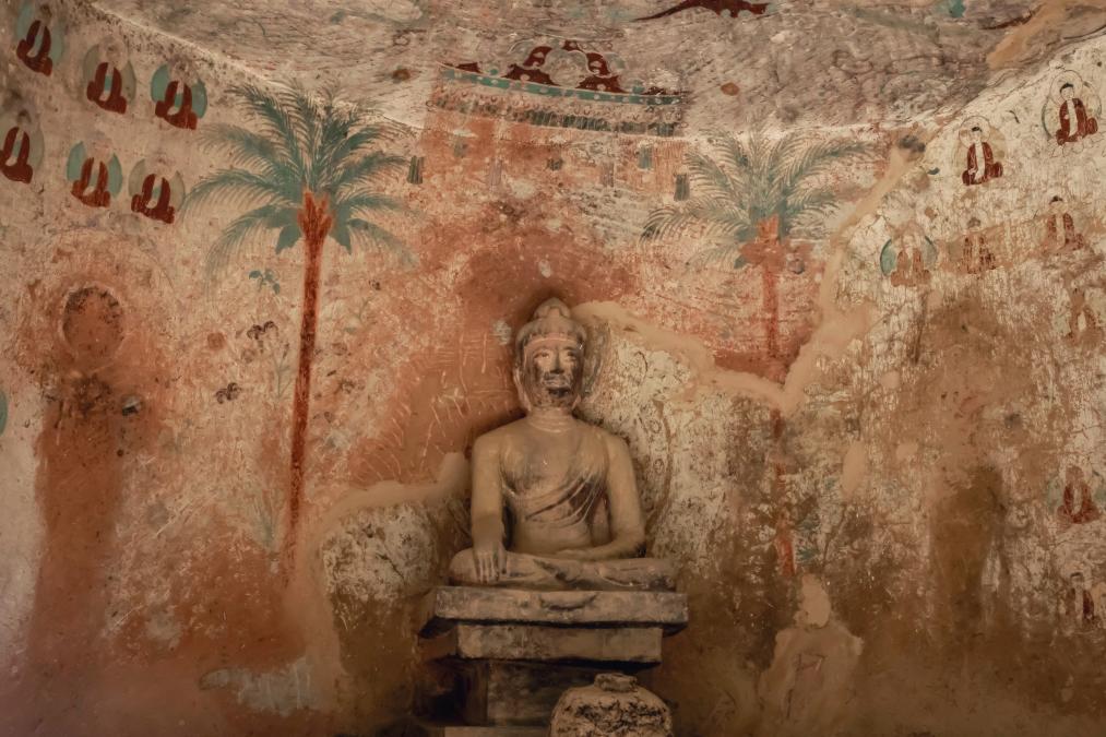 “第11窟開鑿于唐代,是一座馬蹄形穹窿頂窟,里面有一主尊石雕造像,身后,兩棵樹干高大形似南方椰子樹的壁畫生動可愛,頂部蓮花藻井和飛天彩繪十分精美。”甘肅炳靈寺文物保護(hù)研究所講解員楊彩霞介紹,唐代是炳靈寺石窟造像的高峰期,現(xiàn)存三分之二的窟龕雕鑿于這一時期。
