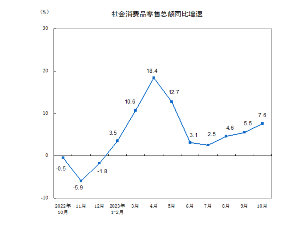 統計數據顯示,10月份,社會消費品零售總額43333億元,同比增長7.6%,增速比9月份加快2.1個百分點??鄢齼r格因素,社會消費品零售總額實際增長8.4%,比9月份加快2.3個百分點。從月度同比增速看,自8月份以來,社零增速持續加快。