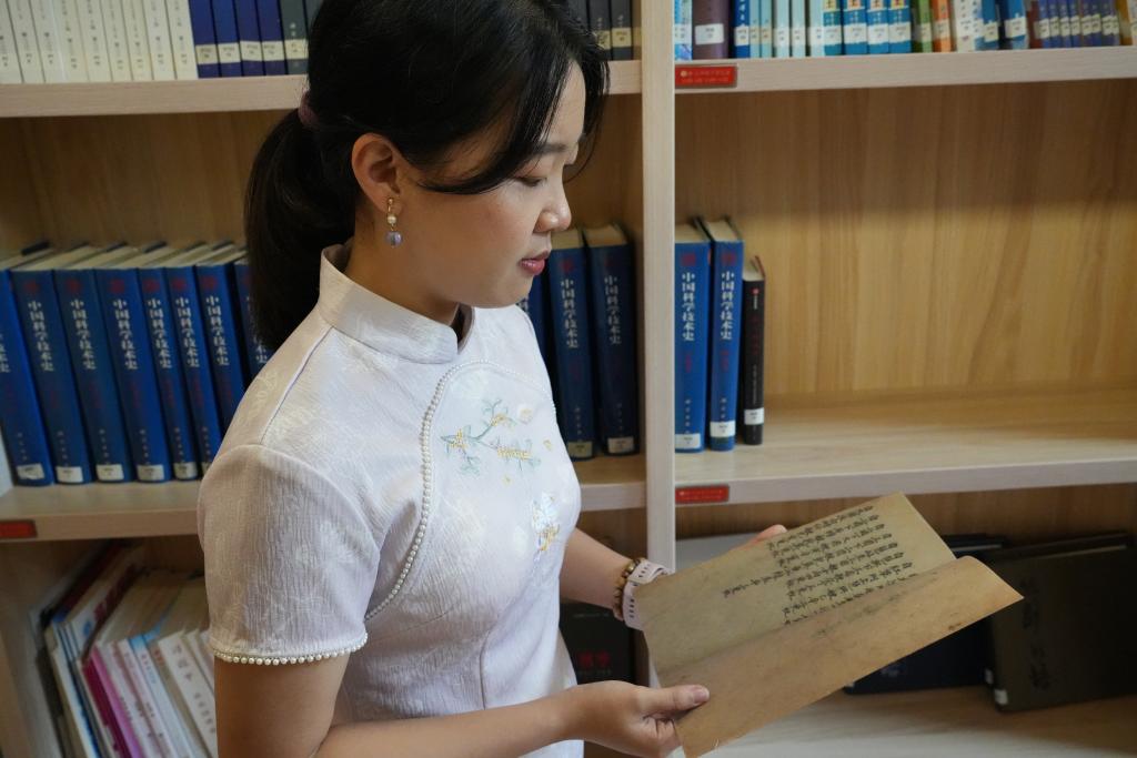 中国(海南)南海博物馆馆员赵珏琪正在翻阅更路簿(复制件)。新华社记者 夏天 摄