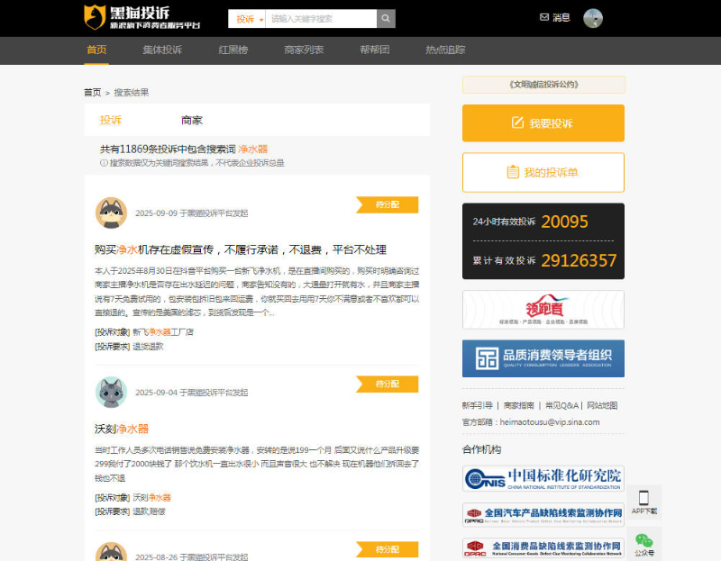 然而,在市场繁荣的背后,行业乱象也逐渐浮出水面。记者在黑猫投诉平台上查询到,关于净水器的投诉量高达11869条。消费者投诉内容主要集中在滤芯使用寿命标注模糊、功能效果虚假宣传、实物与宣传描述不符,以及针对老年群体的误导性推销等方面。