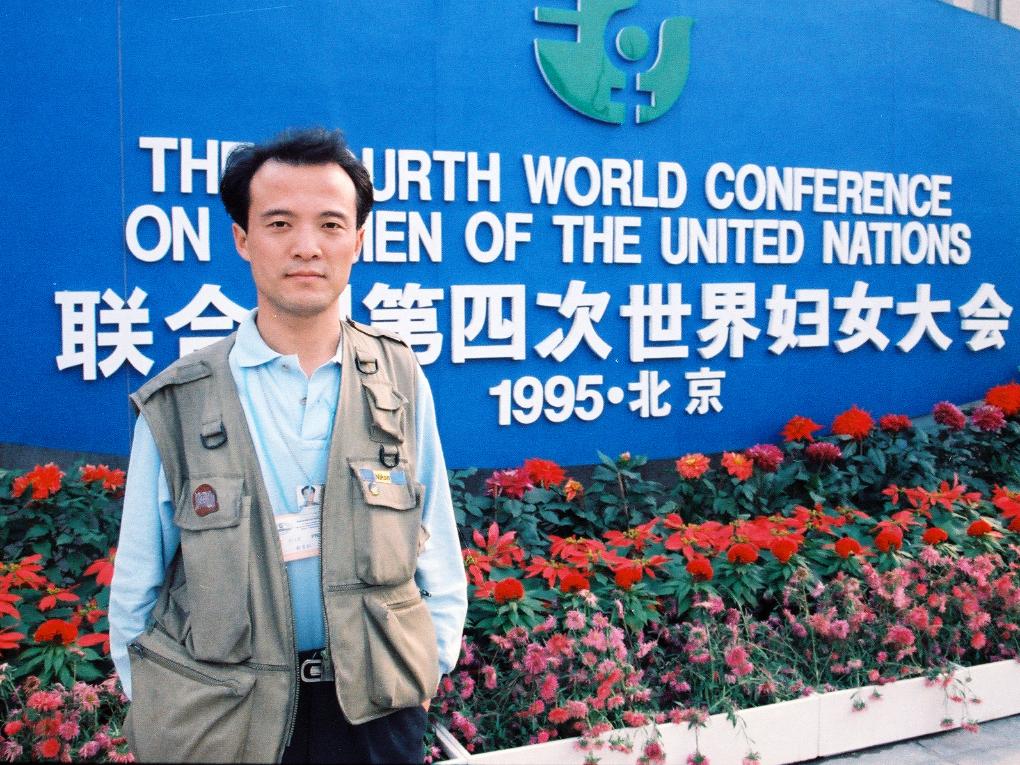 1995年,记者刘卫兵在世界妇女大会场外留影。