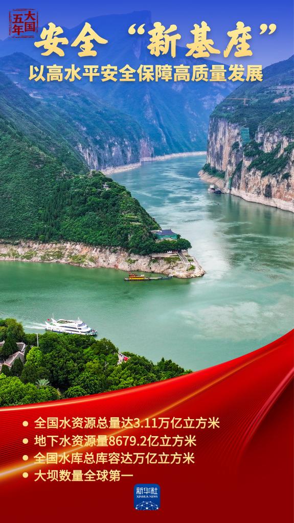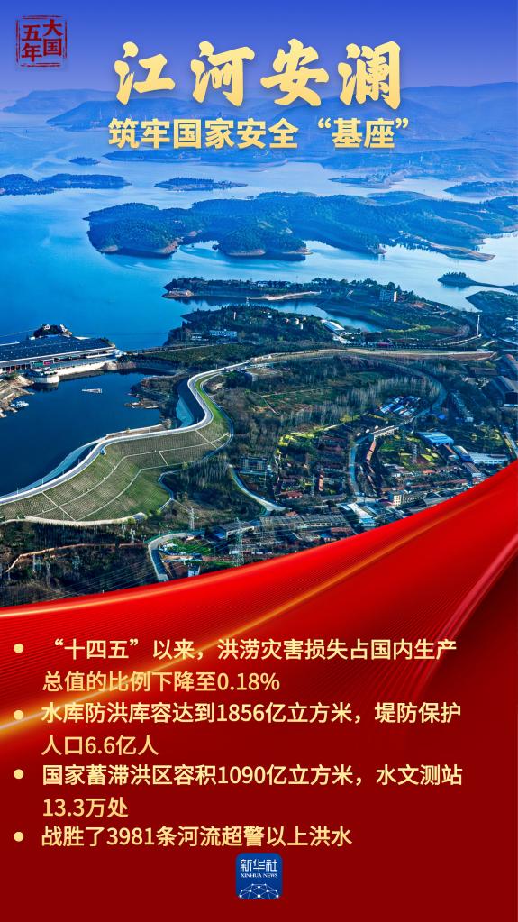 水运连着国运,江河滋养文明。“十四五”期间,我国接续奋战,建成了世界上规模最大、功能最全、惠及人口最多的水利基础设施体系:洪涝灾害损失占国内生产总值的比例下降至0.18%;断流多年的一批河流泉眼复流复涌;以用水总量的零增长,支撑了经济总量连跨大台阶、粮食产量连年丰收的治水用水兴水奇迹……