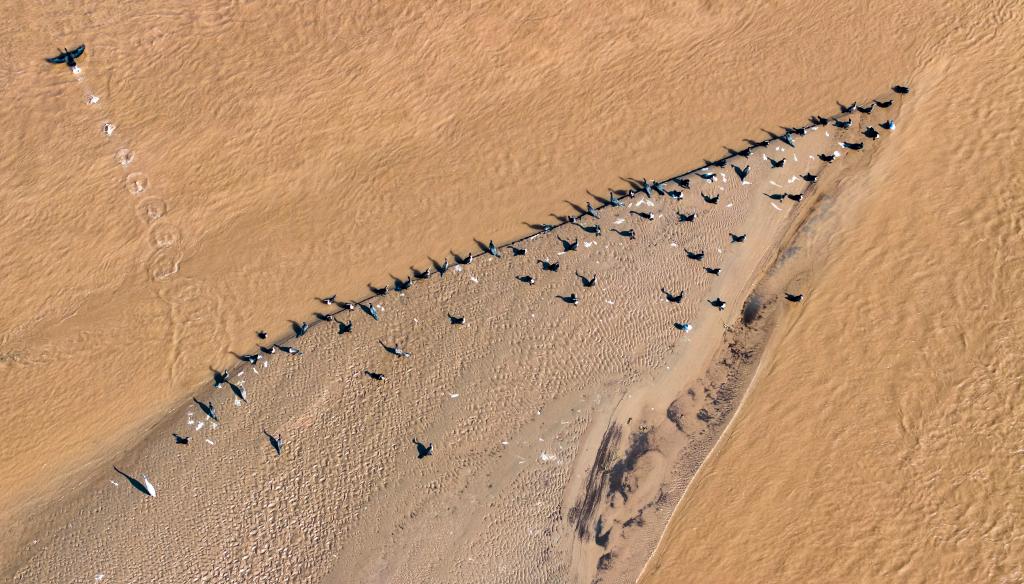 11月4日,在位于宁夏灵武市境内的黄河,候鸟在河滩上驻足栖息(无人机照片)。新华社记者 杨植森 摄