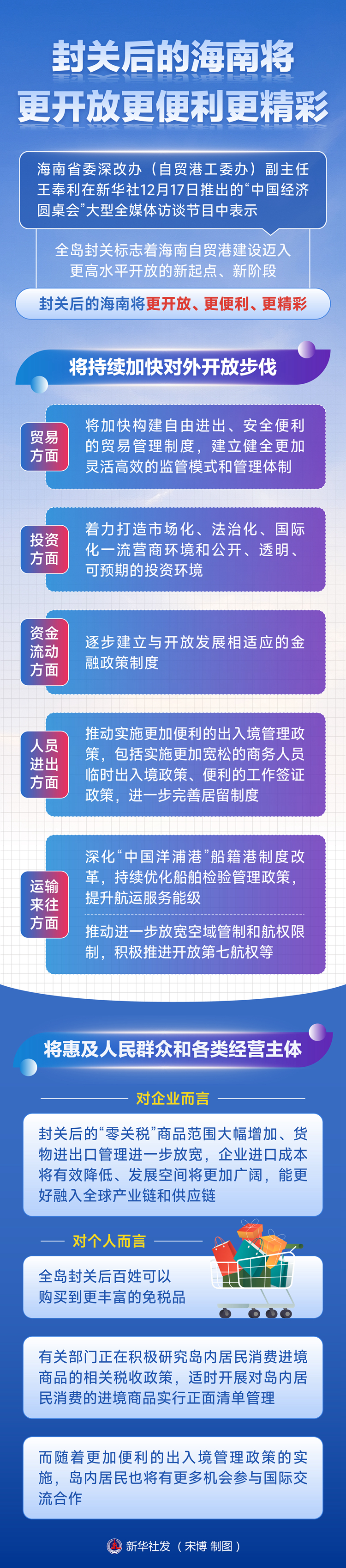 新华社北京12月17日电(记者赵叶苹、魏弘毅)海南省委深改办(自贸港工委办)副主任王奉利在新华社17日推出的“中国经济圆桌会”大型全媒体访谈节目中表示,全岛封关标志着海南自贸港建设迈入更高水平开放的新起点、新阶段,封关后的海南将更开放、更便利、更精彩。