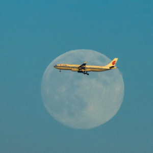 2025年12月4日晚,在北京市拍摄的一架飞机飞过超级月亮。(吴鲁萍 摄)