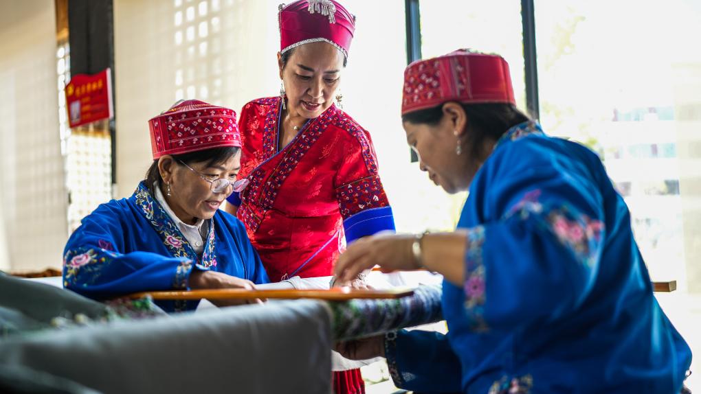 10月10日,苗族绣娘龙禄颖在位于贵州省施秉县的非遗工坊指导绣娘进行刺绣创作。新华社记者陶亮摄