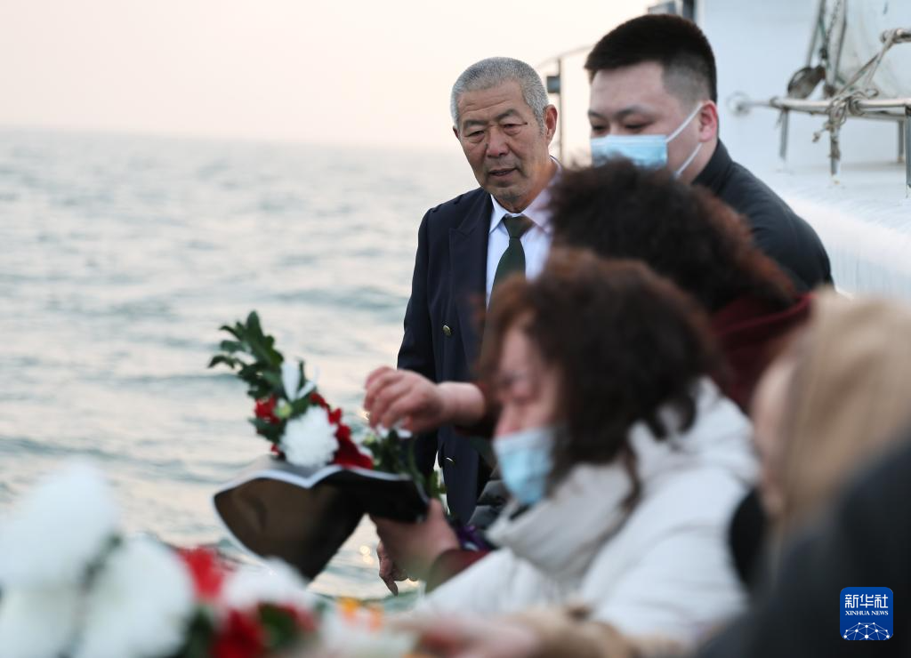 逝者家属乘坐海葬船在指定的海葬海域祭奠亲人(4月3日摄)。