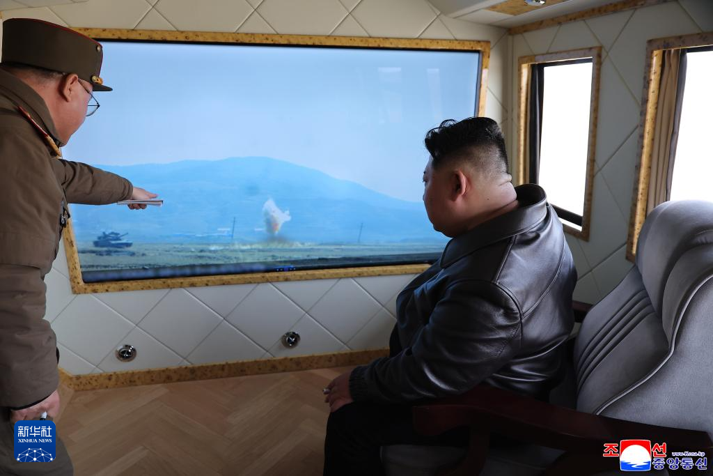 据朝中社3月29日报道,朝鲜劳动党总书记、国务委员会委员长金正恩观摩了使用碳纤维复合材料的大功率固体燃料发动机地上点火试验,以及由国防科学院装甲武器研究所组织的坦克能力评估试验。 新华社/朝中社