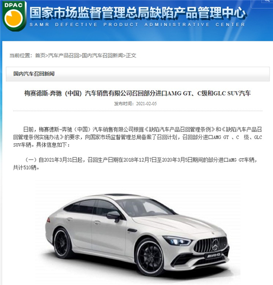 5日,梅赛德斯-奔驰(中国)汽车销售有限公司宣布将召回共计1460辆进口AMG GT、C级和GLC SUV汽车,且三款车型召回原因各不相同。