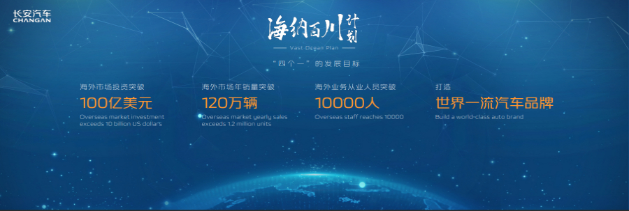 长安汽车董事长朱华荣在发布会上表示:到2030年,长安汽车海外市场将实现“四个一”的发展目标,即海外市场投资突破100亿美元,海外市场年销量突破120万辆,海外业务从业人员突破10000人,将长安汽车打造成世界一流的汽车品牌。