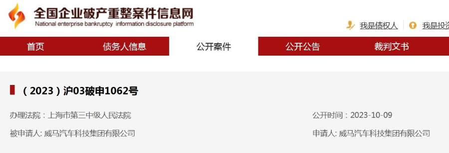 10日稍早,全国企业破产重整案件信息网显示,威马汽车被申请破产重整,申请人正是威马汽车自己。
