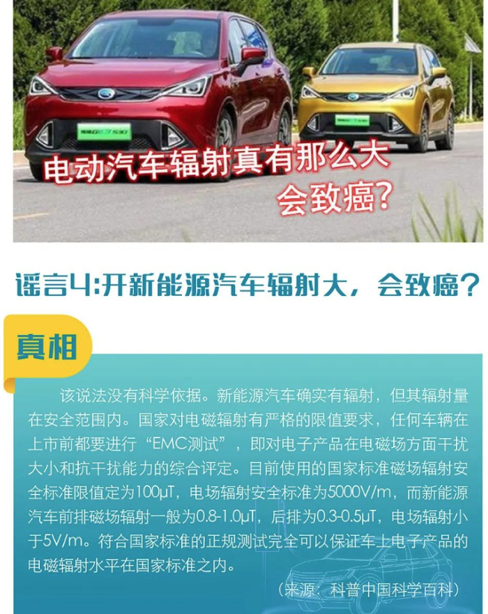 近日,中国互联网联合辟谣平台发布《2023年新能源汽车行业辟谣榜》,其中针对网上流传的“开新能源汽车辐射大、会致癌”说法进行了权威辟谣。
