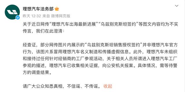 日前,有传言称理想汽车和乌兹别克斯坦某经销商进行了签约活动。4月13日,理想汽车对此回应称,关于近日网传“理想汽车出海最新进展”“乌兹别克斯坦签约”等图文内容均为不实传言。