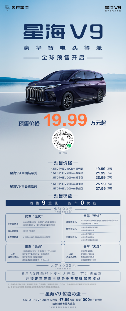 同时,风行星海V9也为下订车主准备了豪华的“预售9重礼”大礼包。预售期即刻交付99元定金,即可享受包括【尊享置换礼】东风风行老车主置换享10000元置换补贴,其他品牌车型置换可享8000元置换补贴;【贴心金融礼】0首付1-5年低息,更有【挚友同行礼】、【即享智驾礼】、【畅享智联礼】、【无线畅联礼】等至诚至意的购车政策,保障准车主们购车无忧、智驾无忧、用车无虑、养车无虑。5月30日前线上支付3000元大定款,可冲抵车款,并锁定首任车主终身免费基础保养权益,让用户轻松享受购车的高品质体验与服务。值得一提的是,东风风行还给用户带来惊喜彩蛋,限量预售1000台1.5TD PHEV 100km实力版车型,预售价只需17.99万元。