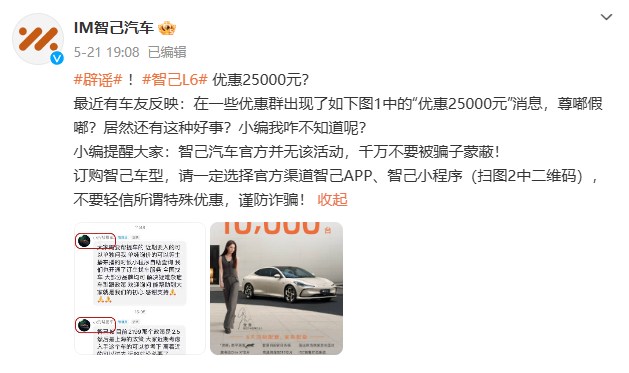 5月21日,@IM智己汽车 发文称,最近有车友反映,在一些优惠群出现了“智己L6优惠25000元”的消息,智己汽车官方并无该活动。
