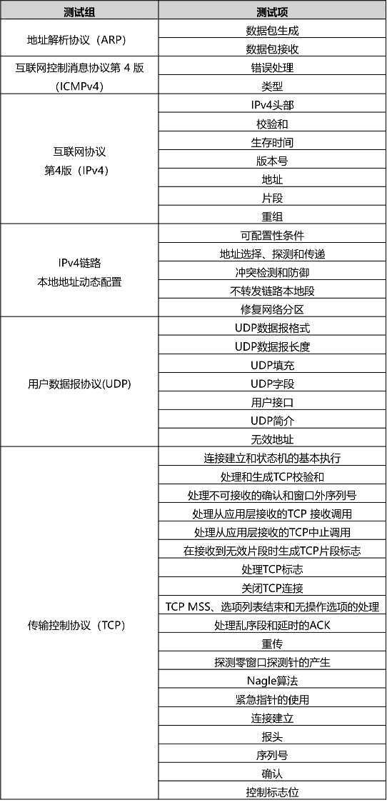 ISO21111-10标准聚焦于网络层与传输层的一致性测试规程,涵盖了车载以太网中网络层与传输层的协议。其中,网络层包含地址解析协议(ARP)、互联网控制消息协议第4版(ICMPv4)、互联网协议第4版(IPv4)以及IPv4链路本地地址的动态配置等一系列测试组。传输层测试规程包括用户数据报协议(UDP)和传输控制协议(TCP)相关用例。