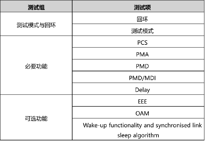 1Gbit/s光纤以太网部件测试项划分情况