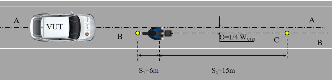 CBLA场景下电动自行车以15km/h的速度以与车辆行驶方向相同的方向移动。VUT分别以20-80km/h的速度测试,其中20km/h、40km/h测试AEB功能,60km/h、80km/h测试FCW功能,碰撞位置在25%处。该场景主要考察车辆系统在直行中,对前方纵向行驶的电动自行车的识别及响应能力。