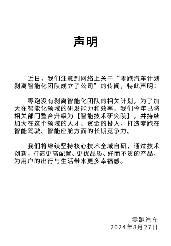 8月27日,针对上述传闻,零跑汽车发布官方声明进行辟谣。声明显示,零跑没有剥离智能化团队的相关计划,为了加大在智能化领域的研发能力和效率,零跑汽车今年已将相关部门整合升级为智能技术研究院。