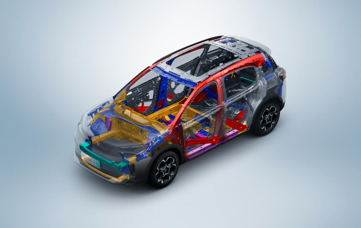 车身强度方面,2026款天逸C5 AIRCROSS拥有至高1600MPa的高强度车身,高强度钢使用比例高达65.06%,在A柱和B柱、车顶轨道、门下围挡、门槛梁等部位大量使用热成型钢(PHS),形成“太空舱”结构,可以在发生严重碰撞时减小变形量,保护车内乘员安全。