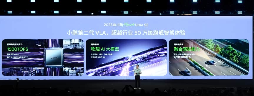 为满足不同用户的智驾需求,新车提供Max版和UltraSE版双算力版本可选,兼顾高阶性能与实用体验,覆盖全场景出行。其中,UltraSE版配备双图灵AI芯片,有效算力高达1500TOPS,搭载小鹏第二代VLA,这是一套面向L4时代的物理世界模型,不仅安心丝滑,全场景都能开,而且像老司机一样高效。而Max版搭载单颗图灵AI芯片,有效算力达750TOPS,目前搭载小鹏第一代VLA,2026年第三季度将开启小鹏第二代VLA蒸馏版上车,在驾驶体验、运行帧率、响应时延与稳定性等维度,完整保留小鹏第二代VLA的核心能力。