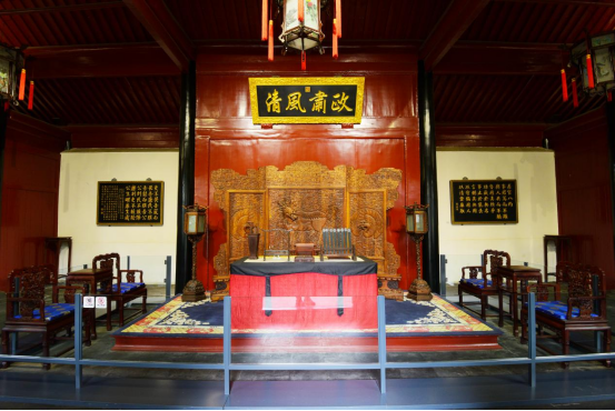 大堂,又称“正堂 ”,面阔五间,前有抱厦三间,该堂始建于明朝初年,堂内装备肃穆,仪卫森严,是封建社会官衙权威的象征。这里是总督拜牌迎旨、举行隆重贺典和重大政务活动的地方。