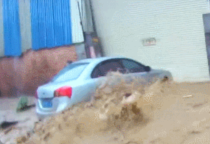 山东省莱州市突降暴雨,在一形成湍急水流的路段,一骑车女子被水冲倒,险些被冲走,一名小伙毫不犹豫飞奔过去将女子救起。