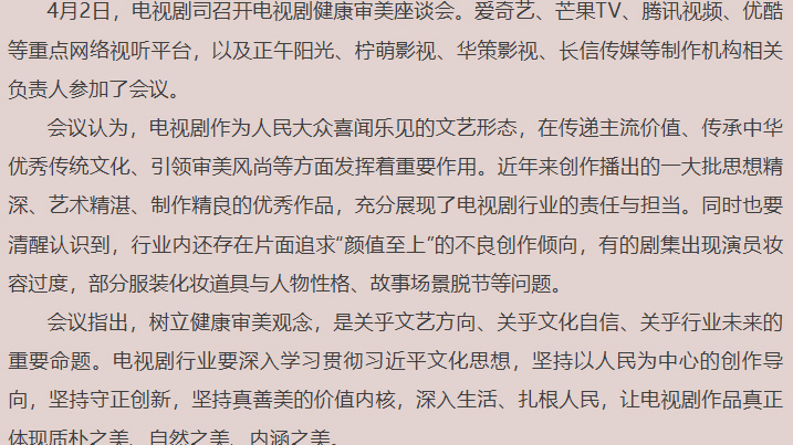 廣電總局:電視劇創(chuàng)作要避免“顏值至上”“流量依賴”