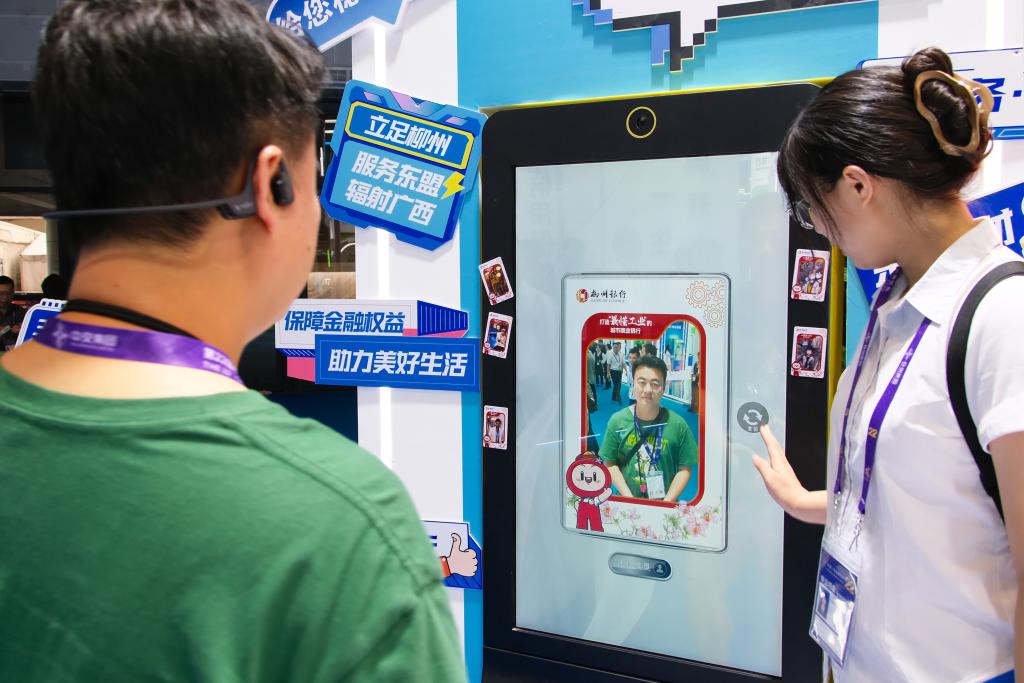 9月17日,参观者在广西南宁国际会展中心内体验一款AI冰箱贴装置。