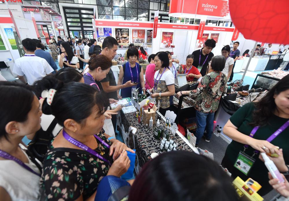 9月17日,在广西南宁国际会展中心,参观者在选购印尼商品。