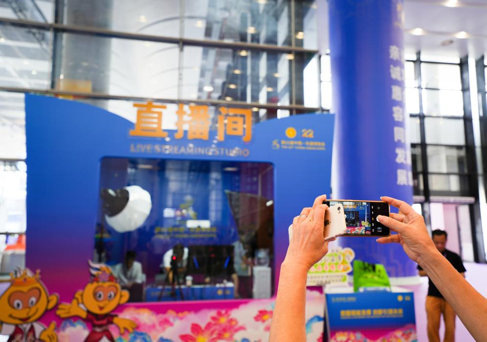 9月17日,在广西南宁国际会展中心,观众拍摄东博会直播间。
