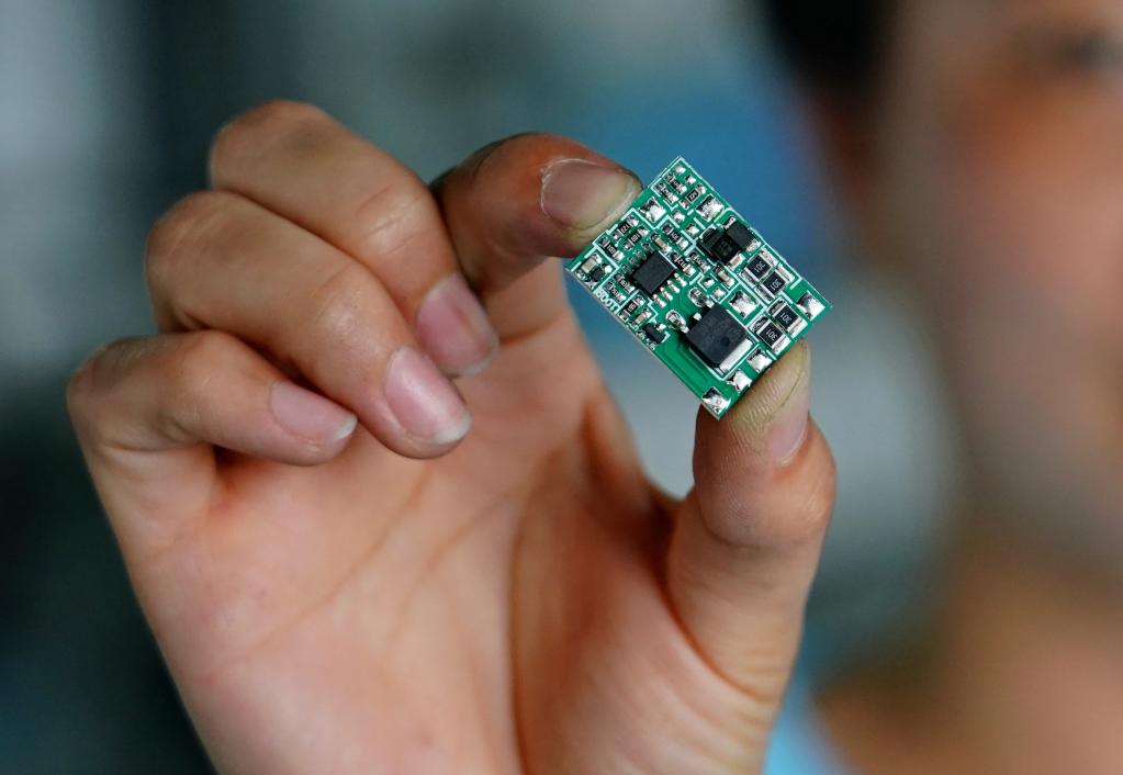 秦皇島經(jīng)濟(jì)技術(shù)開發(fā)區(qū)一家汽車電器生產(chǎn)企業(yè)的職工展示一款汽車電器設(shè)備的芯片。新華社發(fā)
