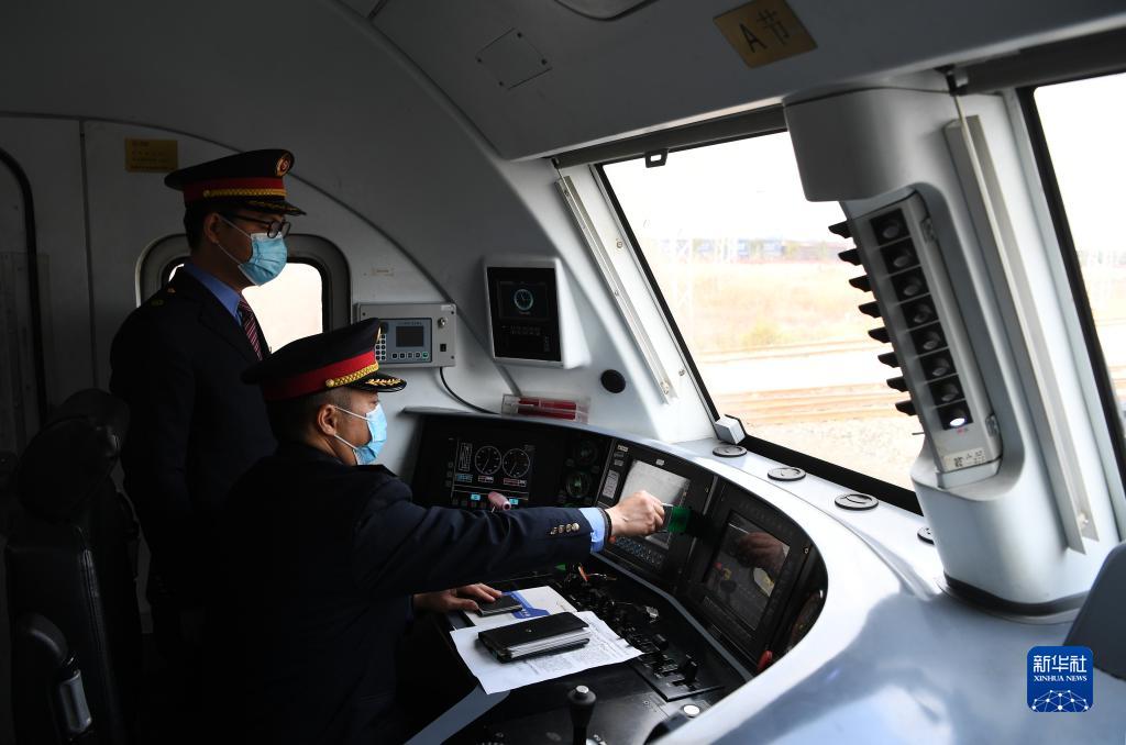 在重慶機務段興隆場北折返所,中歐班列首發司機江彤(前)在值乘機車上做發車前的準備(2021年1月28日攝)。新華社記者 王全超 攝