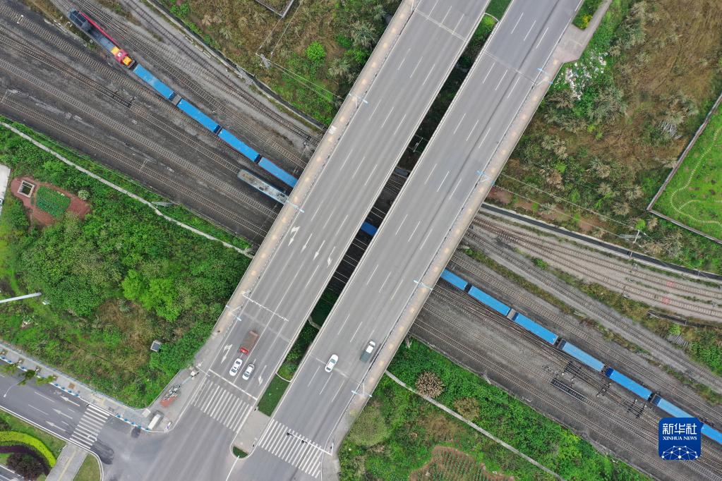 2021年3月19日,中歐班列(渝新歐)十周年紀念專列從重慶一座公路橋下穿過(無人機照片)。新華社記者 唐奕 攝