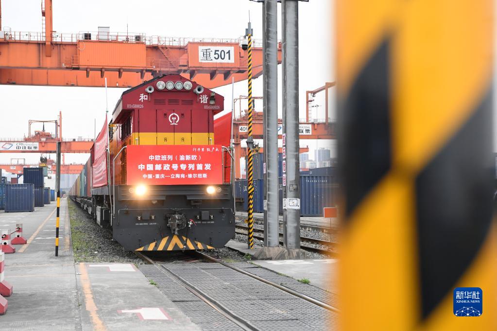 2020年4月3日,中歐班列(渝新歐)“中國郵政號”專列從重慶出發前往立陶宛。本次列車共發運44個集裝箱,包括來自北京、廣東、湖南及重慶本地的國際郵件42箱和救援物資2箱。新華社記者 唐奕 攝