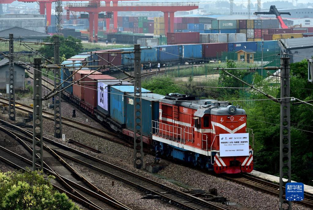 2020年6月5日,滿載防疫物資的“義新歐”中歐班列(義烏-馬德里)在義烏西站啟程,前往西班牙首都馬德里。新華社發(呂斌 攝)