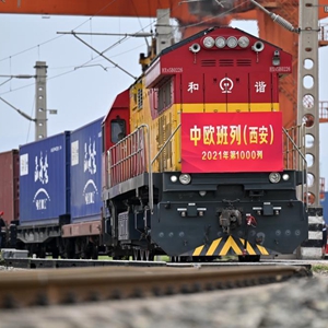 2021年4月13日,X9041次中歐班列(西安)從西安國際港站出發。這是2021年陜西開行的第1000列中歐班列。新華社記者 李一博 攝